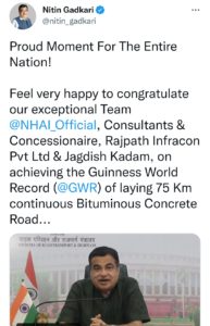 105 घंटे और 33 मिनट में एनएच53 पर एक ही लेन में 75 किलोमीटर बिटुमिनस कंक्रीट बिछाने में एनएचएआई के बनाए गए नए गिनीज वर्ल्ड रिकॉर्ड की की घोषणा।