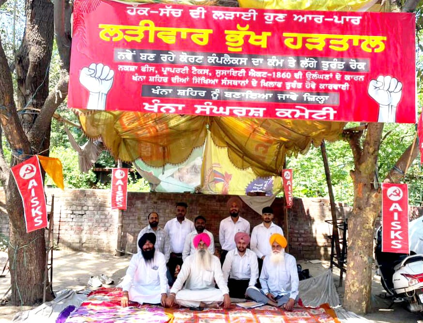 ਬੁੱਲੇਪੁਰ (ਖੰਨਾ) ਵਿਖੇ ਨਵੇਂ ਕੋਰਟ ਕੰਪਲੈਕਸ ਦੇ ਵਿਰੋਧ ਅਤੇ ਖੰਨਾ ਨੂੰ ਪੂਰਨ ਜ਼ਿਲ੍ਹਾ ਬਣਾਉਣ, ਨਕਸਾ ਫੀਸ, ਪ੍ਰਾਪਰਟੀ ਟੈਕਸ, ਸੋਸਾਇਟੀ ਰਜਿਸਟਰੇਸ਼ਨ ਐਕਟ 1860 ਦੀ ਉਲੰਘਣਾ ਕਰਨ ਵਾਲੀਆਂ ਵਿਦਿਆਕ ਸੰਸਥਾਵਾਂ ਦੇ ਖਿਲਾਫ ਕਾਰਵਾਈ ਦੀਆਂ ਮੰਗਾ ਸਬੰਧੀ ਖੰਨਾ ਸੰਘਰਸ਼ ਕਮੇਟੀ ਵੱਲੋਂ ਉਪ ਮੰਡਲ ਮਜਿਸਟ੍ਰੇਟ ਦਫ਼ਤਰ ਸਾਹਮਣੇ ਚੱਲ ਰਹੀ “ਲੜੀਵਾਰ ਭੁੱਖ ਹੜਤਾਲ” ਅੱਜ 92ਵੇਂ ਦਿਨ ਵਿੱਚ ਦਾਖ਼ਲ ਹੋ ਗਈ ਹੈ।
